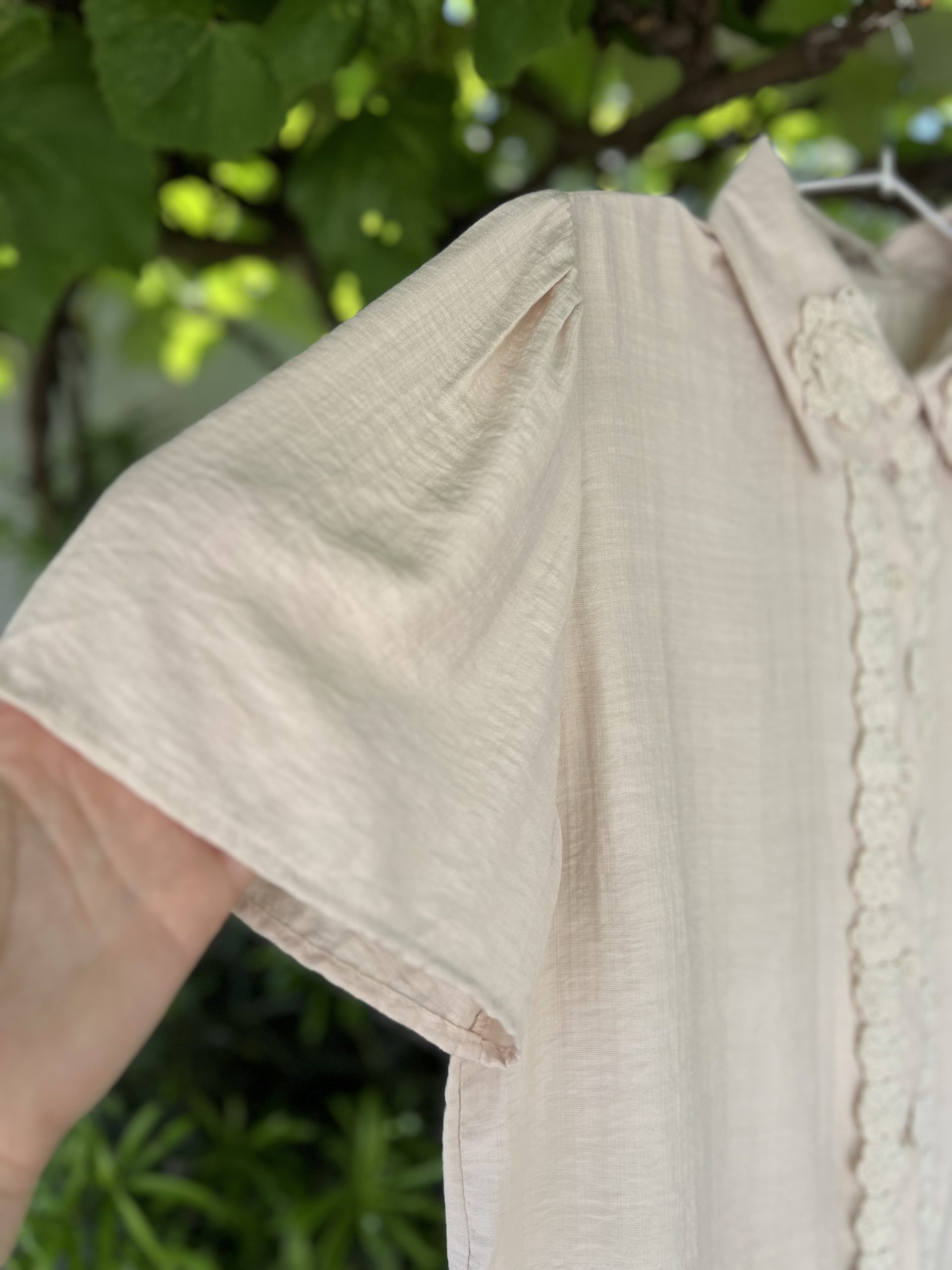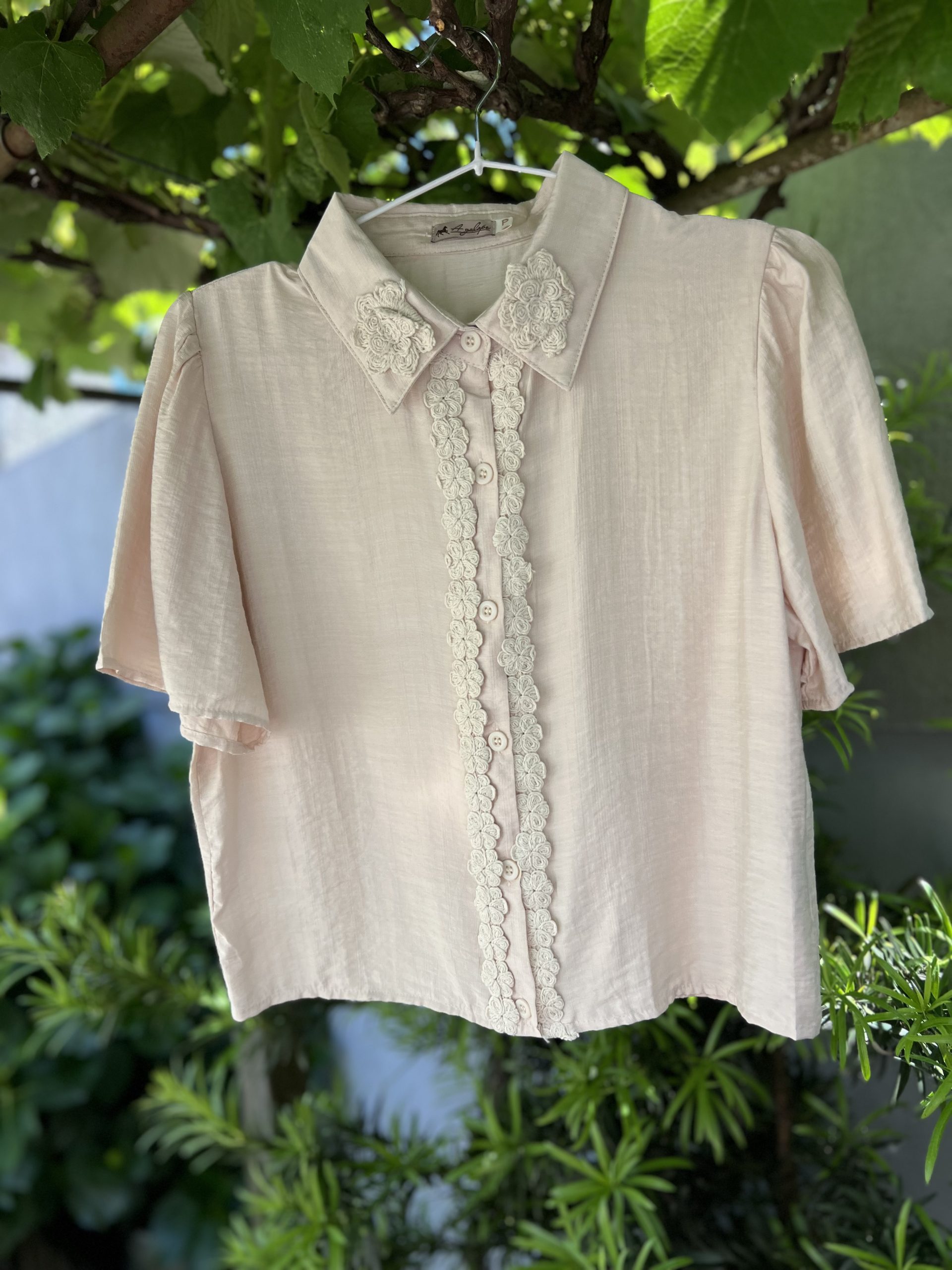 O tom pastel dessa peça transmite uma sensação de leveza e calma e torna fácil sua combinação. As aplicações de delicadas flores, semelhantes a flores em crochê, em sua parte frontal e na gola, dão um charme e um diferencial na hora de montar o seu look.